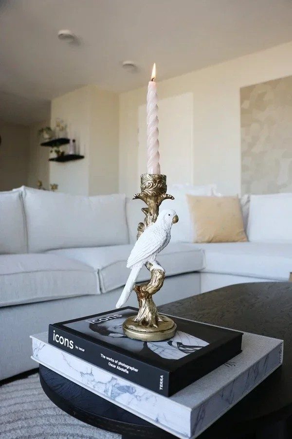 Opzoek naar een mooie en unieke kandelaar? wat vind je van deze witte papegaai die in een boom zit naar rechts kijkend?Het voordeel van deze papegaai is dat die rustig blijft zitten op de plek waar jij hem neer zet, en geheel niet onbelangrijk, hij laat je vloer netjes schoon.