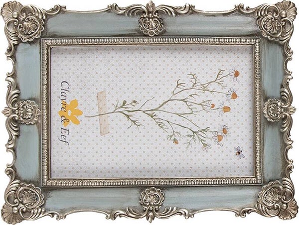 Decoratieve blauw met zilverkleurige fotolijst, in een klassieke stijl, van het merk Clayre & Eef. Deze lijst is alleen staand te gebruiken, horizontaal en verticaal. Afmeting lijst 15x2x20 cm.