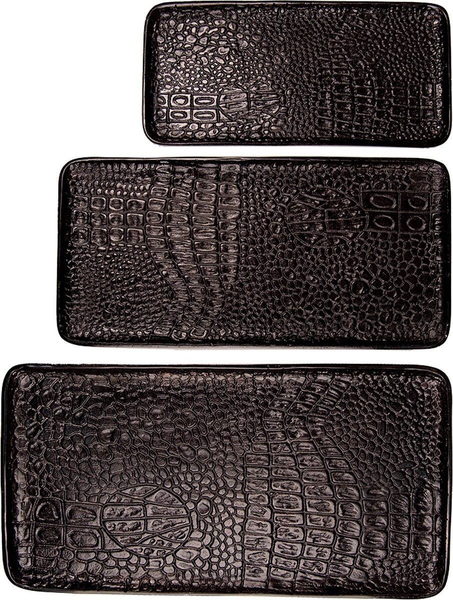 Set van drie zwarte aluminium dienbladen, in een industriele stijl met een stoere look. Afmetingen 55x28x2 / 48x23x2 / 38x18x2 cm.