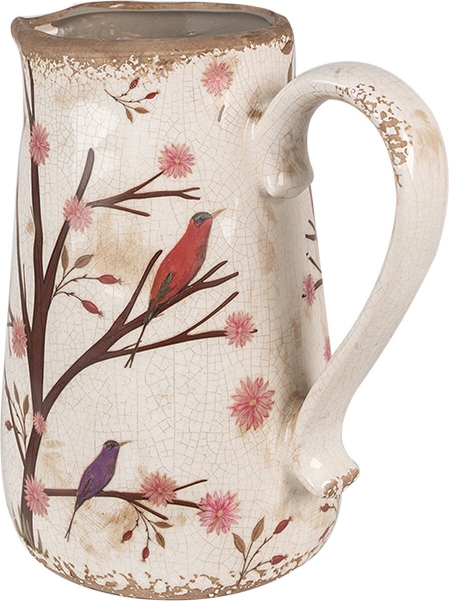 Decoratieve beige, keramieken schenkkan, met een motief van bruine takken met roze bloemen en vogeltjes, in een landelijke stijl. Deze kan is onderdeel van een serie. Opening 11x10 cm. Diepte schenkkan 21 cm.