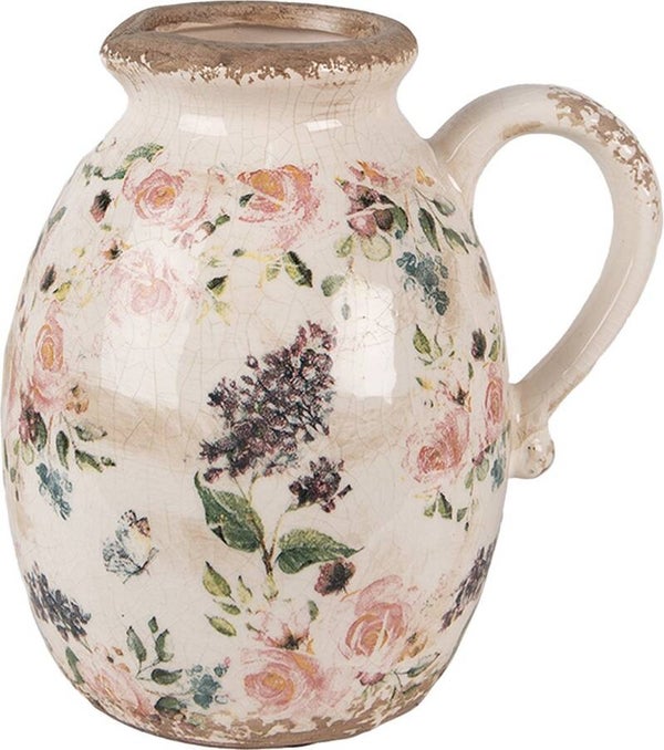 Decoratieve beige keramieken schenkkan, met een kleurrijk motief van roze bloemen, in een landelijke stijl. Deze kan is onderdeel van een serie. Opening Ø 6 cm. Diepte schenkkan 17 cm.