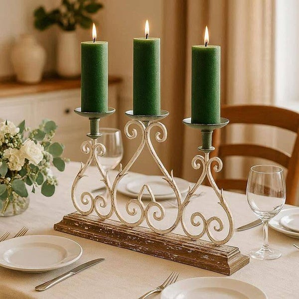 Bruin metalen vintage kaarshouder geschikt voor drie kaarsen op een houten ondergrond van het merk Clayre & Eef.