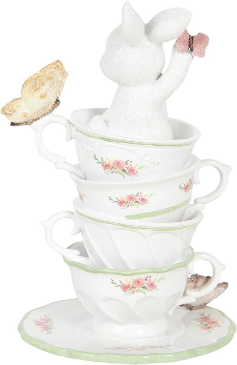 Beeld van een konijn in een stapel kopjes van het merk Clayre & Eef Leuke decoratie voor in je interieur.