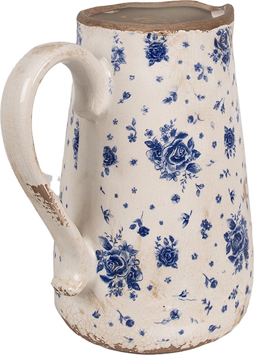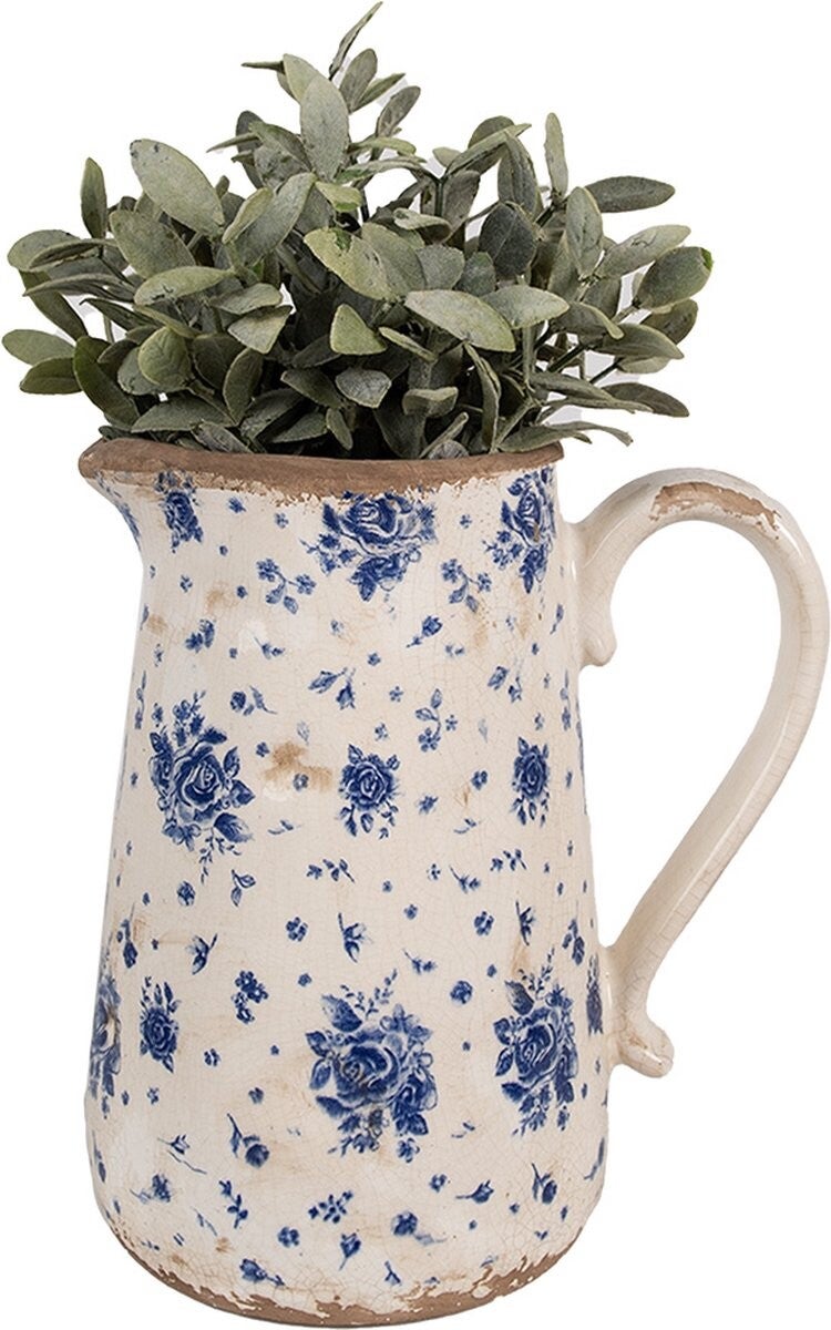 Decoratieve beige, keramieken schenkkan met een kleurrijk motief van blauwe roosjes, in een romantische stijl. Deze kan is onderdeel van een serie.