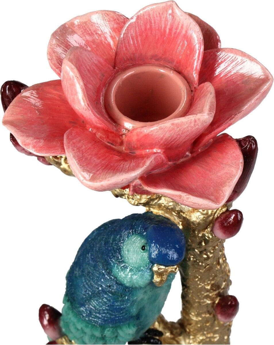Kandelaar Bird, met zijn weelderige flora en fauna, is een absolute eyecatcher in jouw interieur. De kleuren van de planten en vogel vormen een elegante mix van rood, roze, blauw, met een subtiel vleugje goud. Hierdoor past kandelaar Bird perfect in een levendige en luxueuze woonstijl, waardoor jouw huis een rijke en sfeervolle uitstraling krijgt.