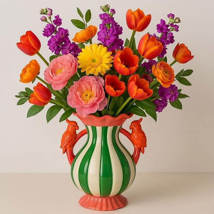 Een multi-kleurige polyresin vaas in de vorm van een vogel van 21x18.5x35cm, ideaal voor een kleurrijke en speelse decoratie.