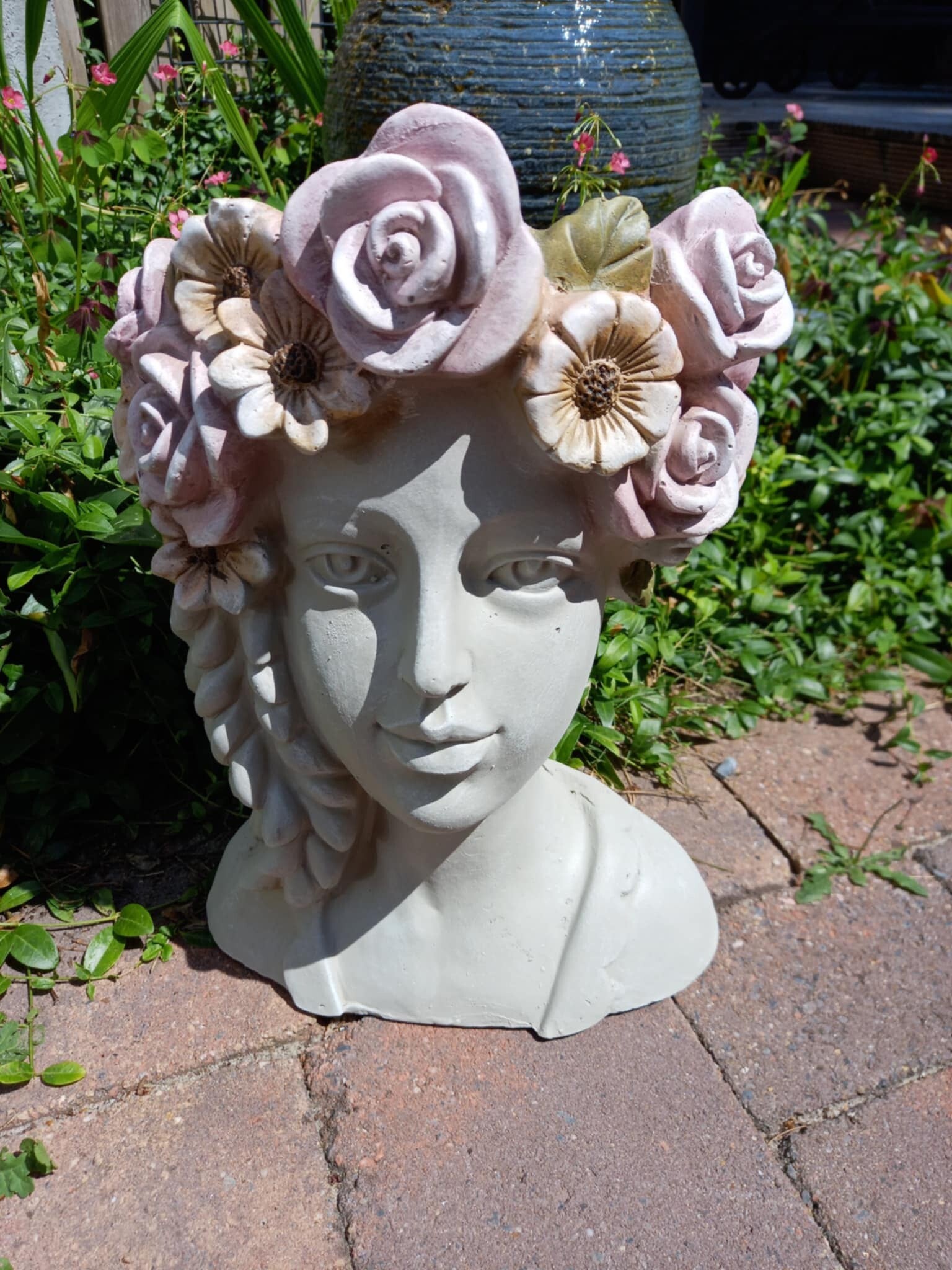 Deze prachtige decoratie/bloempot dame is gemaakt van magnesium. Het beeld is vorstbestendig en uv-proof, hierdoor is dit beeld geschikt voor zowel binnen als buiten. Magnesium beelden zijn licht van gewicht en eenvoudig schoon te houden en te onderhouden.