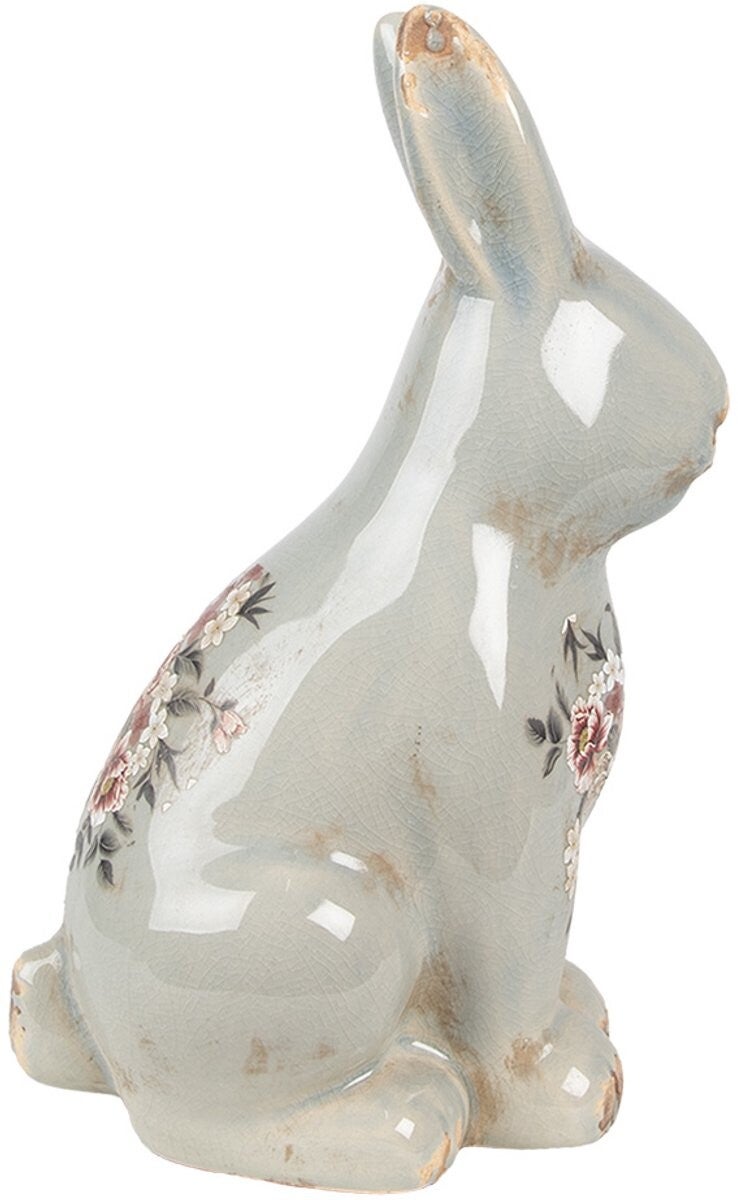 Een mooi decoratief beeldje van een grijs, keramisch konijn met een landelijke uitstraling. Leuk als decoratie voor Pasen of als cadeau-idee. Het maakt deel uit van een serie van bloempotten en vazen.