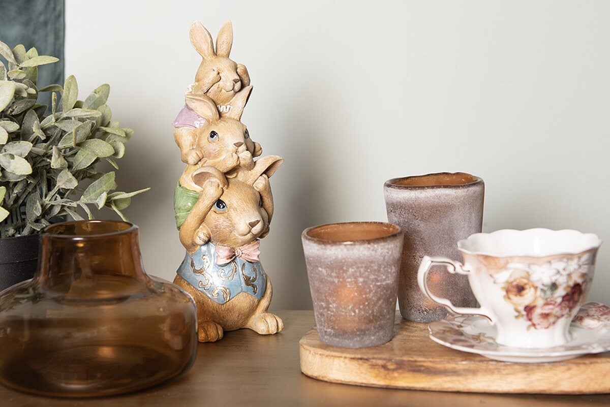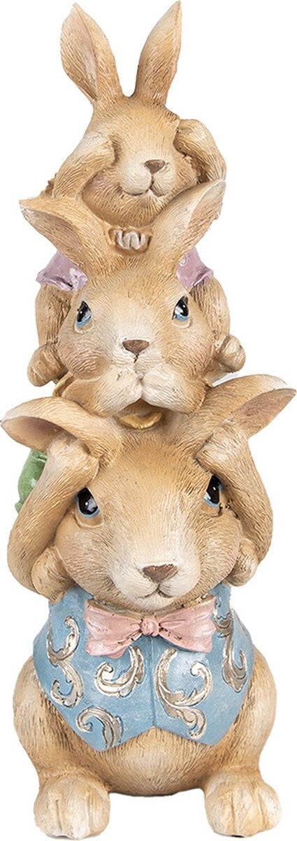 Leuk decoratief kleurrijk beeldje van drie konijnen die horen zien en zwijgen uitbeelden, in een landelijke stijl, van het merk Clayre & Eef. Ook leuk als decoratie voor Pasen. Afmeting 8x9x25 cm.Woonaccessoires Paashaas Pasen